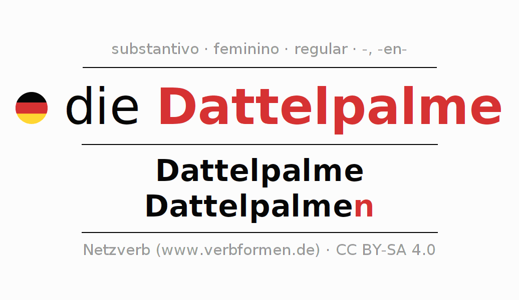 A declinação do substantivo Dattelpalme (palmeira-das-datéis, tamareira) está no genitivo singular Dattelpalme e no nominativo plural Dattelpalmen . O substantivo fraco Dattelpalme é declinado com a terminação -/n. O gênero gramatical de Dattelpalme é feminino e o artigo definido é "die". Não se pode somente declinar o substantivo Dattelpalme mas sim todos os substantivos em alemão. Comentários ☆