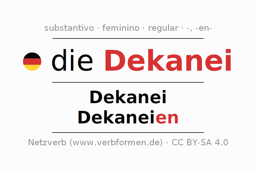 Declinação de Dekanei é apresentada em uma tabela com todas as formas no singular e no plural (plural) e em todos os quatro casos: nominativo (1º caso), genitivo (2º caso), dativo (3º caso) e acusativo (4º caso) . Especialmente para os alunos de alemão, a correta declinação da palavra Dekanei é fundamental.