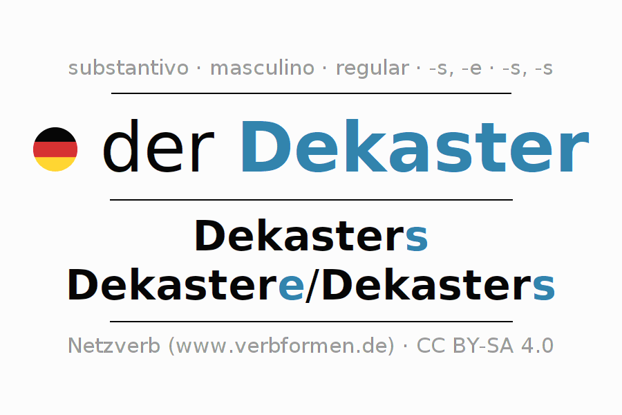 A declinação do substantivo Dekaster está no genitivo singular Dekasters e no nominativo plural Dekastere/Dekasters . O substantivo forte Dekaster é declinado com a terminação s/e/s. O gênero gramatical de Dekaster é masculino e o artigo definido é 'der'. Não se pode somente declinar o substantivo Dekaster mas sim todos os substantivos em alemão. Comentários ☆