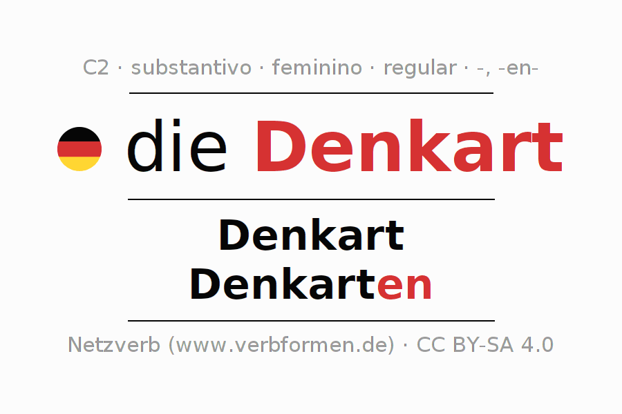 Declinação de Denkart é apresentada em uma tabela com todas as formas no singular e no plural (plural) e em todos os quatro casos: nominativo (1º caso), genitivo (2º caso), dativo (3º caso) e acusativo (4º caso) . Especialmente para os alunos de alemão, a correta declinação da palavra Denkart é fundamental.