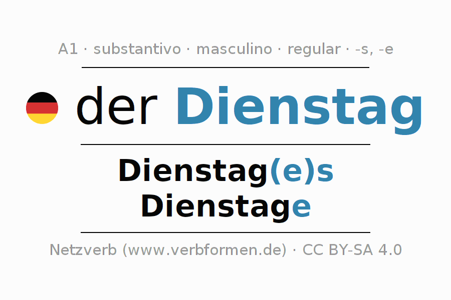 Declinação de Dienstag é apresentada em uma tabela com todas as formas no singular e no plural (plural) e em todos os quatro casos: nominativo (1º caso), genitivo (2º caso), dativo (3º caso) e acusativo (4º caso) . Especialmente para os alunos de alemão, a correta declinação da palavra Dienstag é fundamental.