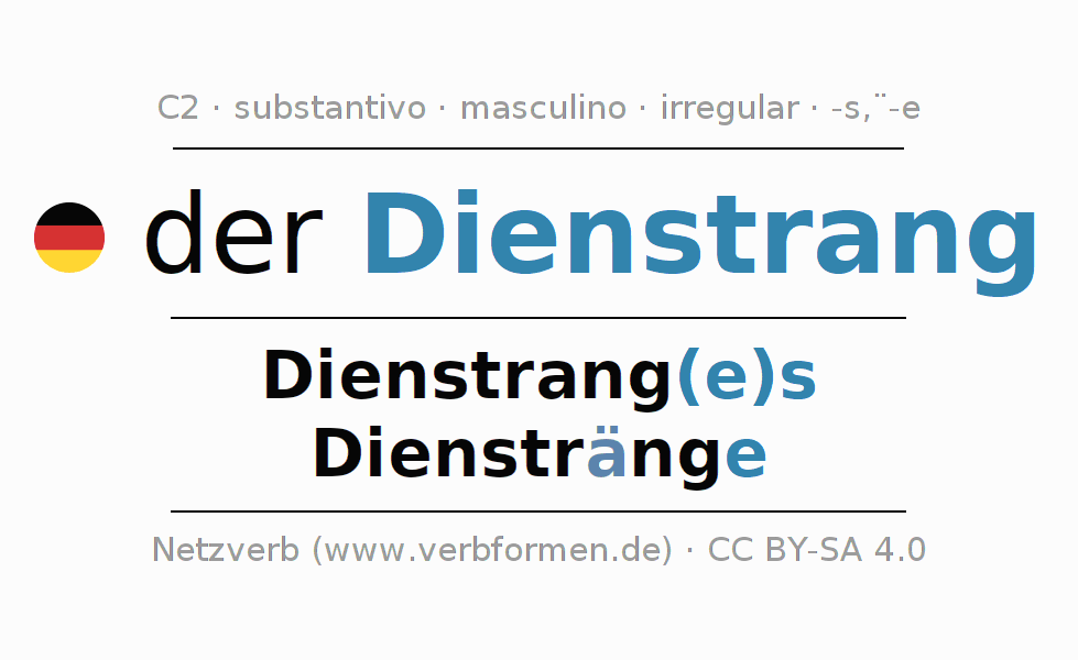 Declinação de Dienstrang é apresentada em uma tabela com todas as formas no singular e no plural (plural) e em todos os quatro casos: nominativo (1º caso), genitivo (2º caso), dativo (3º caso) e acusativo (4º caso) . Especialmente para os alunos de alemão, a correta declinação da palavra Dienstrang é fundamental.