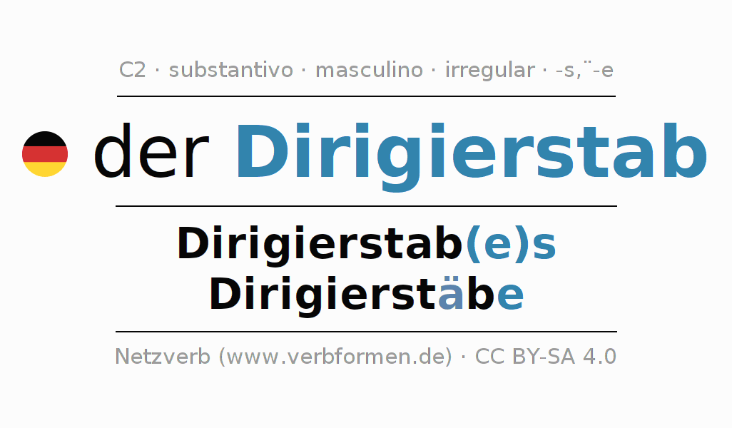 A declinação do substantivo Dirigierstab (bastão de maestro) está no genitivo singular Dirigierstab(e)s e no nominativo plural Dirigierstäbe . O substantivo forte Dirigierstab é declinado com a terminação es/ä-e. No plural com um trema. O gênero gramatical de Dirigierstab é masculino e o artigo definido é 'der'. Não se pode somente declinar o substantivo Dirigierstab mas sim todos os substantivos em alemão. O substantivo faz parte do vocabulário referente ao Certificado em Alemão do Nível C2. Comentários ☆