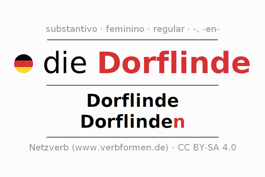 A declinação do substantivo Dorflinde (linda da aldeia) está no genitivo singular Dorflinde e no nominativo plural Dorflinden . O substantivo fraco Dorflinde é declinado com a terminação -/n. O gênero gramatical de Dorflinde é feminino e o artigo definido é "die". Não se pode somente declinar o substantivo Dorflinde mas sim todos os substantivos em alemão. Comentários ☆