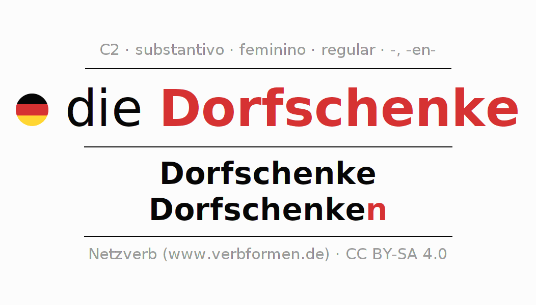 Declinação de Dorfschenke é apresentada em uma tabela com todas as formas no singular e no plural (plural) e em todos os quatro casos: nominativo (1º caso), genitivo (2º caso), dativo (3º caso) e acusativo (4º caso) . Especialmente para os alunos de alemão, a correta declinação da palavra Dorfschenke é fundamental.