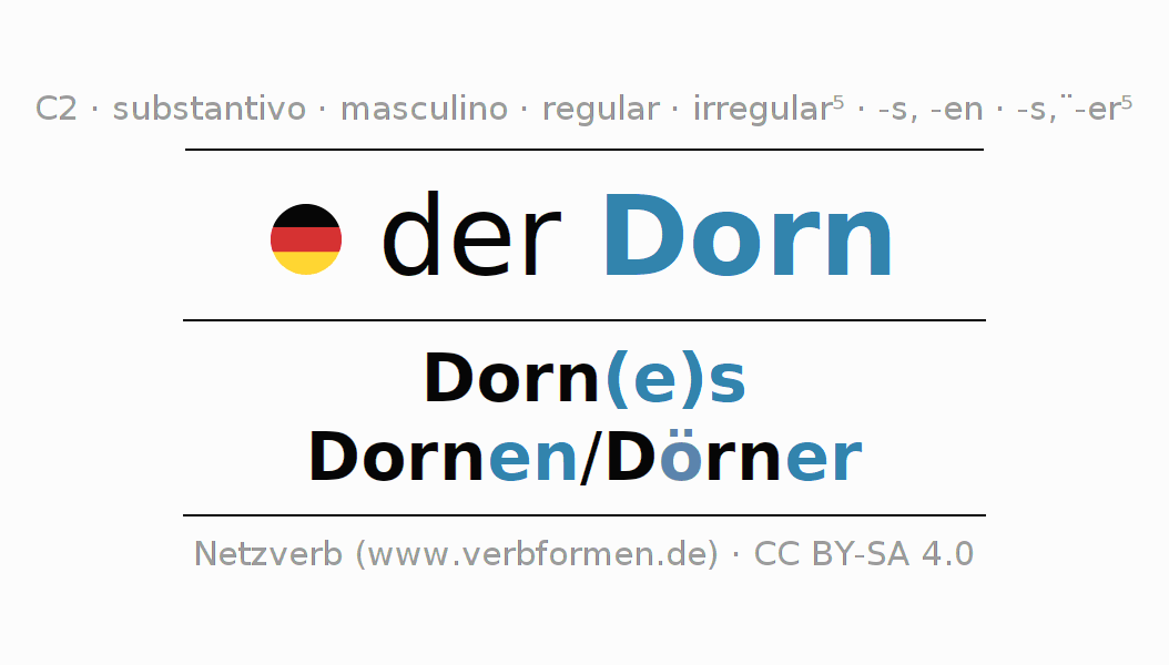 Declinação de Dorn (Dornen) é apresentada em uma tabela com todas as formas no singular e no plural (plural) e em todos os quatro casos: nominativo (1º caso), genitivo (2º caso), dativo (3º caso) e acusativo (4º caso) . Especialmente para os alunos de alemão, a correta declinação da palavra Dorn (Dornen) é fundamental.