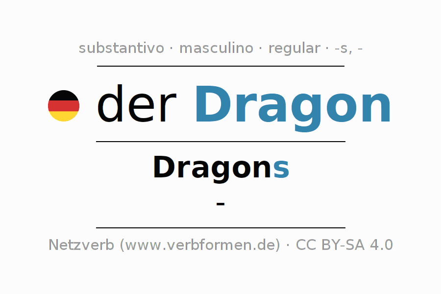 A declinação do substantivo Dragon (dragão) está no genitivo singular Dragons e no nominativo plural - . O substantivo forte Dragon é declinado com a terminação s/-. Não há formas no plural. O gênero gramatical de Dragon é masculino e o artigo definido é 'der'. O substantivo também pode ser usado com outros géneros e outros artigos. Não se pode somente declinar o substantivo Dragon mas sim todos os substantivos em alemão. Comentários ☆