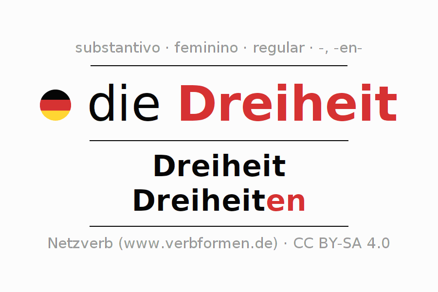 Declinação de Dreiheit é apresentada em uma tabela com todas as formas no singular e no plural (plural) e em todos os quatro casos: nominativo (1º caso), genitivo (2º caso), dativo (3º caso) e acusativo (4º caso) . Especialmente para os alunos de alemão, a correta declinação da palavra Dreiheit é fundamental.