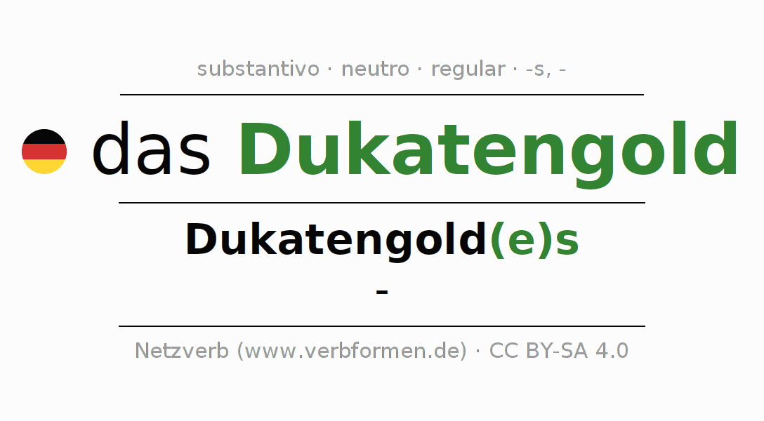 A declinação do substantivo Dukatengold está no genitivo singular Dukatengold(e)s e no nominativo plural - . O substantivo forte Dukatengold é declinado com a terminação es/-. Não há formas no plural. O gênero gramatical de Dukatengold é neutro e o artigo definido é "das". Não se pode somente declinar o substantivo Dukatengold mas sim todos os substantivos em alemão. Comentários ☆