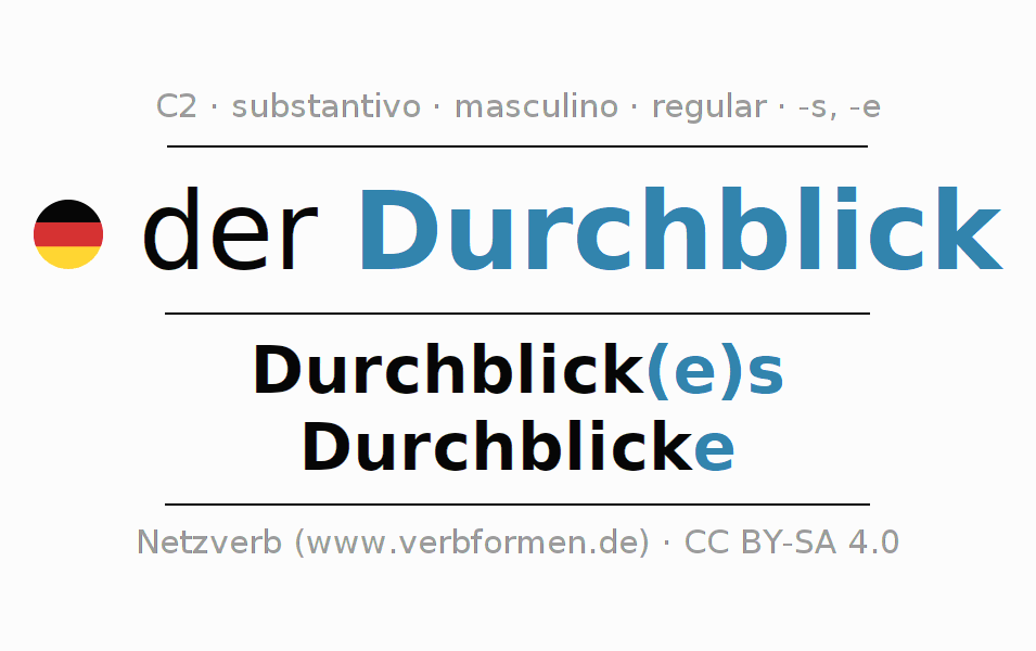 Declinação de Durchblick é apresentada em uma tabela com todas as formas no singular e no plural (plural) e em todos os quatro casos: nominativo (1º caso), genitivo (2º caso), dativo (3º caso) e acusativo (4º caso) . Especialmente para os alunos de alemão, a correta declinação da palavra Durchblick é fundamental.