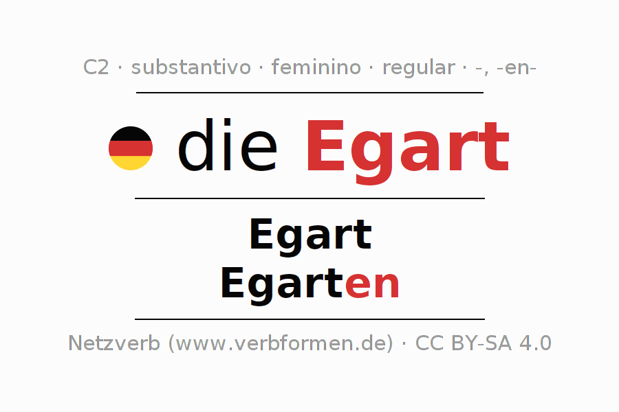 Declinação de Egart é apresentada em uma tabela com todas as formas no singular e no plural (plural) e em todos os quatro casos: nominativo (1º caso), genitivo (2º caso), dativo (3º caso) e acusativo (4º caso) . Especialmente para os alunos de alemão, a correta declinação da palavra Egart é fundamental.