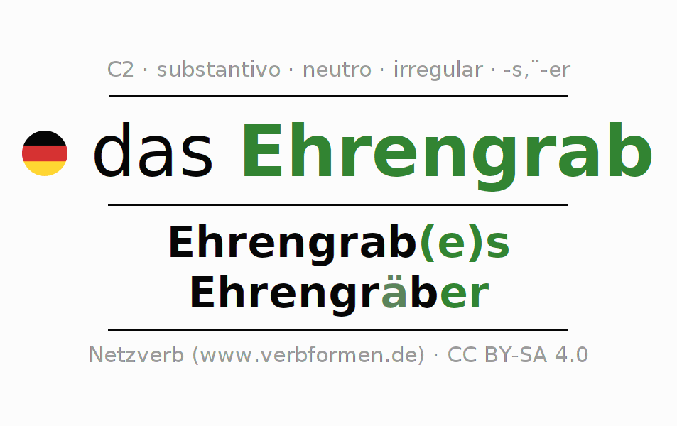 A declinação do substantivo Ehrengrab (túmulo honorário) está no genitivo singular Ehrengrab(e)s e no nominativo plural Ehrengräber . O substantivo forte Ehrengrab é declinado com a terminação es/ä-er. No plural com um trema. O gênero gramatical de Ehrengrab é neutro e o artigo definido é "das". Não se pode somente declinar o substantivo Ehrengrab mas sim todos os substantivos em alemão. O substantivo faz parte do vocabulário referente ao Certificado em Alemão do Nível C2. Comentários ☆