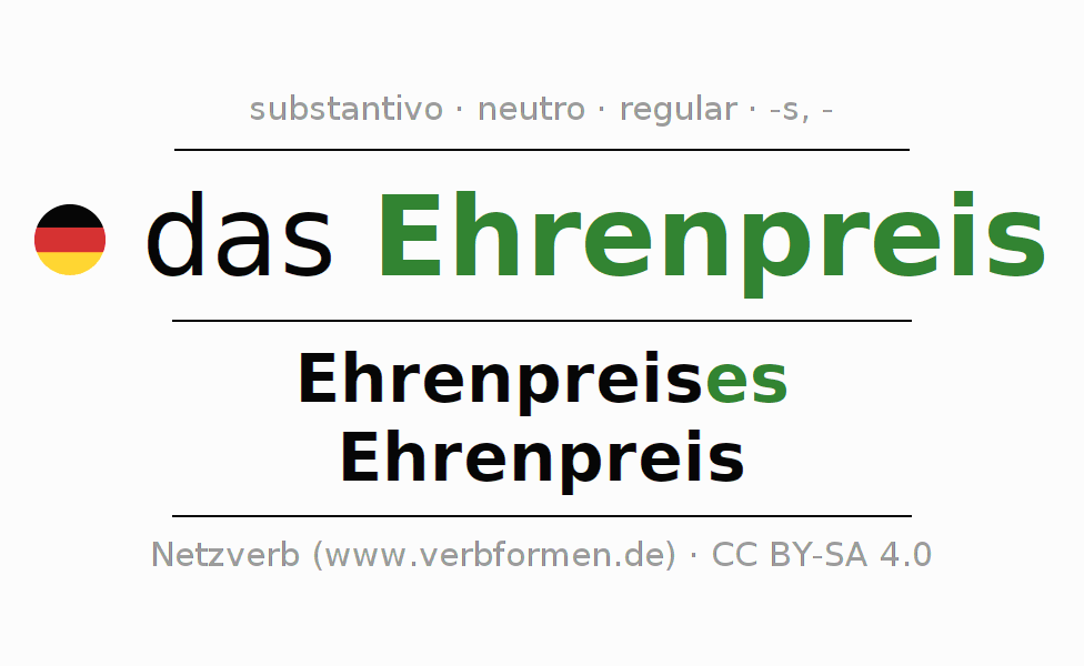 A declinação do substantivo Ehrenpreis (distinção, honra) está no genitivo singular Ehrenpreises e no nominativo plural Ehrenpreis . O substantivo forte Ehrenpreis é declinado com a terminação es/-. Mas pode também ser usado para outros fins. O gênero gramatical de Ehrenpreis é neutro e o artigo definido é "das". O substantivo também pode ser usado com outros géneros e outros artigos. Não se pode somente declinar o substantivo Ehrenpreis mas sim todos os substantivos em alemão. Comentários ☆