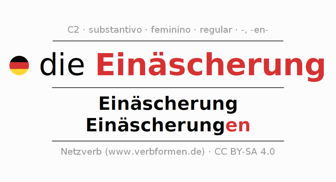 A declinação do substantivo Einäscherung (cremação, incineração) está no genitivo singular Einäscherung e no nominativo plural Einäscherungen . O substantivo fraco Einäscherung é declinado com a terminação -/en. O gênero gramatical de Einäscherung é feminino e o artigo definido é "die". Não se pode somente declinar o substantivo Einäscherung mas sim todos os substantivos em alemão. O substantivo faz parte do vocabulário referente ao Certificado em Alemão do Nível C2. Comentários ☆