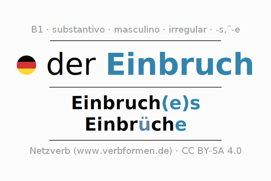 Declinação de Einbruch é apresentada em uma tabela com todas as formas no singular e no plural (plural) e em todos os quatro casos: nominativo (1º caso), genitivo (2º caso), dativo (3º caso) e acusativo (4º caso) . Especialmente para os alunos de alemão, a correta declinação da palavra Einbruch é fundamental.