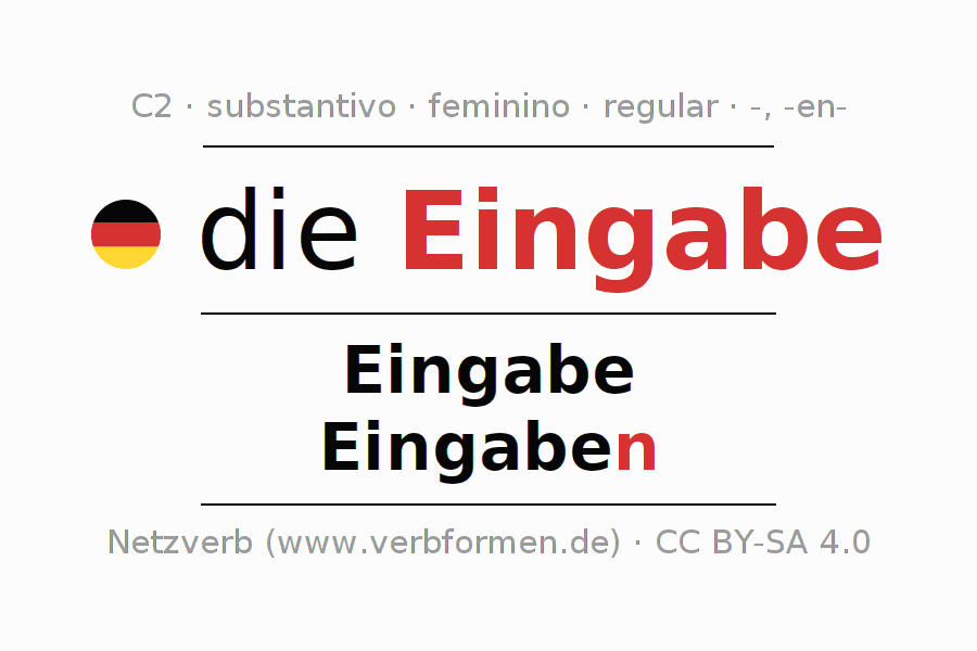 Declinação de Eingabe é apresentada em uma tabela com todas as formas no singular e no plural (plural) e em todos os quatro casos: nominativo (1º caso), genitivo (2º caso), dativo (3º caso) e acusativo (4º caso) . Especialmente para os alunos de alemão, a correta declinação da palavra Eingabe é fundamental.