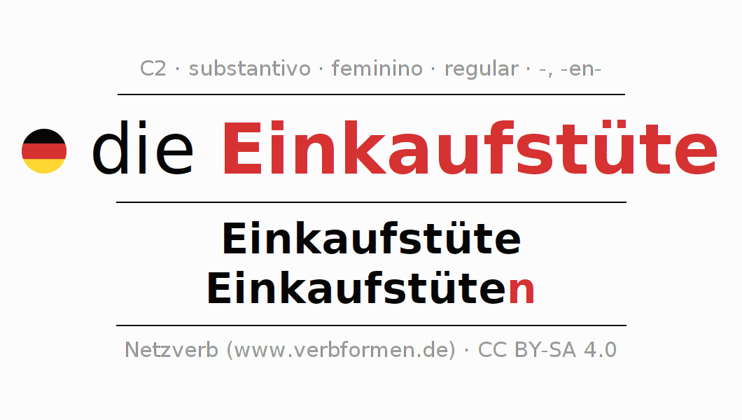A declinação do substantivo Einkaufstüte (sacola de compras, sacola) está no genitivo singular Einkaufstüte e no nominativo plural Einkaufstüten . O substantivo fraco Einkaufstüte é declinado com a terminação -/n. O gênero gramatical de Einkaufstüte é feminino e o artigo definido é "die". Não se pode somente declinar o substantivo Einkaufstüte mas sim todos os substantivos em alemão. O substantivo faz parte do vocabulário referente ao Certificado em Alemão do Nível C2. Comentários ☆