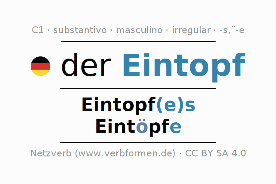 Declinação de Eintopf é apresentada em uma tabela com todas as formas no singular e no plural (plural) e em todos os quatro casos: nominativo (1º caso), genitivo (2º caso), dativo (3º caso) e acusativo (4º caso) . Especialmente para os alunos de alemão, a correta declinação da palavra Eintopf é fundamental.