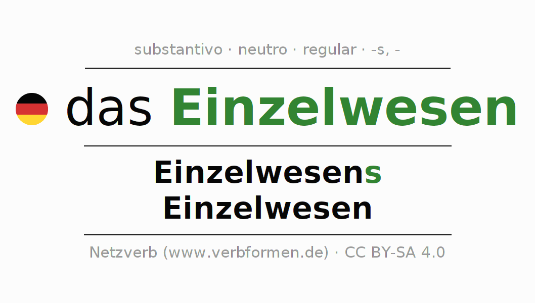 A declinação do substantivo Einzelwesen (indivíduo, ser) está no genitivo singular Einzelwesens e no nominativo plural Einzelwesen . O substantivo forte Einzelwesen é declinado com a terminação s/-. O gênero gramatical de Einzelwesen é neutro e o artigo definido é "das". Não se pode somente declinar o substantivo Einzelwesen mas sim todos os substantivos em alemão. Comentários ☆
