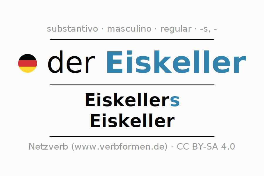 A declinação do substantivo Eiskeller (depósito de gelo, geladeira) está no genitivo singular Eiskellers e no nominativo plural Eiskeller . O substantivo forte Eiskeller é declinado com a terminação s/-. O gênero gramatical de Eiskeller é masculino e o artigo definido é 'der'. Não se pode somente declinar o substantivo Eiskeller mas sim todos os substantivos em alemão. Comentários ☆