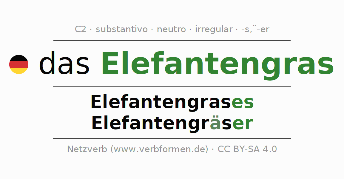 Declinação de Elefantengras é apresentada em uma tabela com todas as formas no singular e no plural (plural) e em todos os quatro casos: nominativo (1º caso), genitivo (2º caso), dativo (3º caso) e acusativo (4º caso) . Especialmente para os alunos de alemão, a correta declinação da palavra Elefantengras é fundamental.