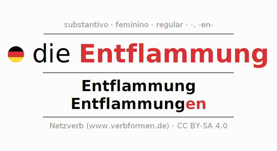 A declinação do substantivo Entflammung está no genitivo singular Entflammung e no nominativo plural Entflammungen . O substantivo fraco Entflammung é declinado com a terminação -/en. O gênero gramatical de Entflammung é feminino e o artigo definido é "die". Não se pode somente declinar o substantivo Entflammung mas sim todos os substantivos em alemão. Comentários ☆