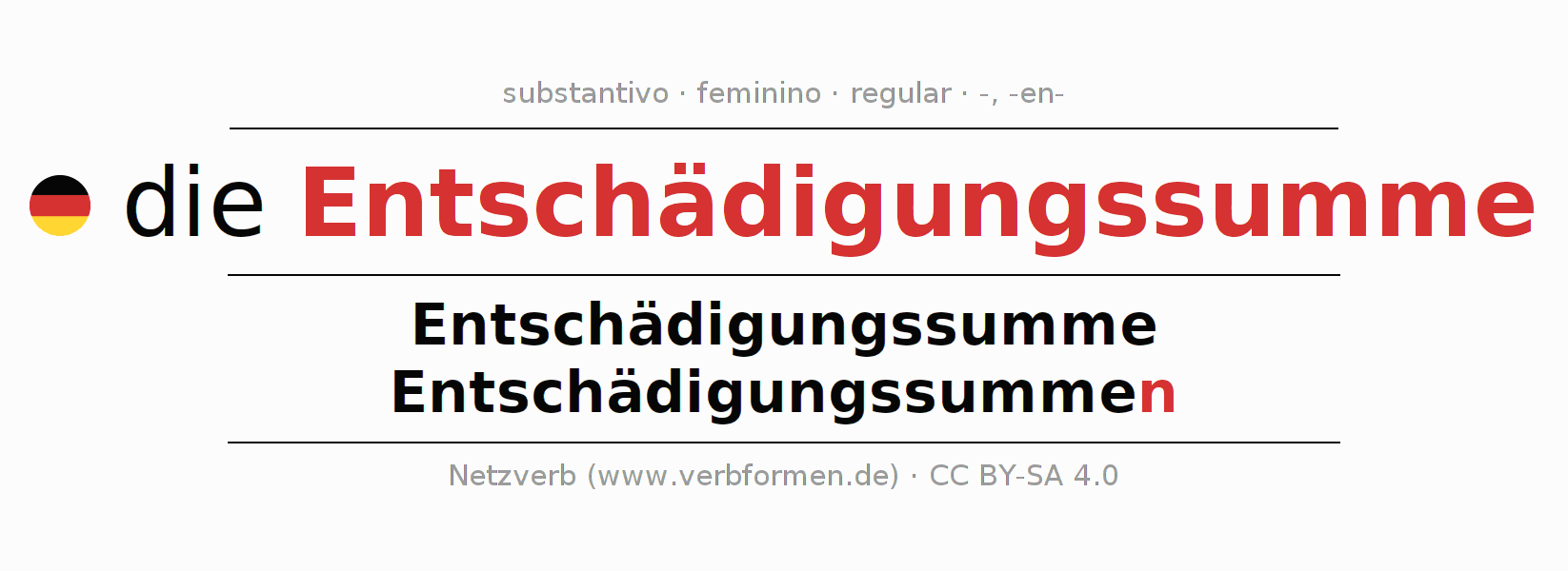 Declinação de Entschädigungssumme é apresentada em uma tabela com todas as formas no singular e no plural (plural) e em todos os quatro casos: nominativo (1º caso), genitivo (2º caso), dativo (3º caso) e acusativo (4º caso) . Especialmente para os alunos de alemão, a correta declinação da palavra Entschädigungssumme é fundamental.