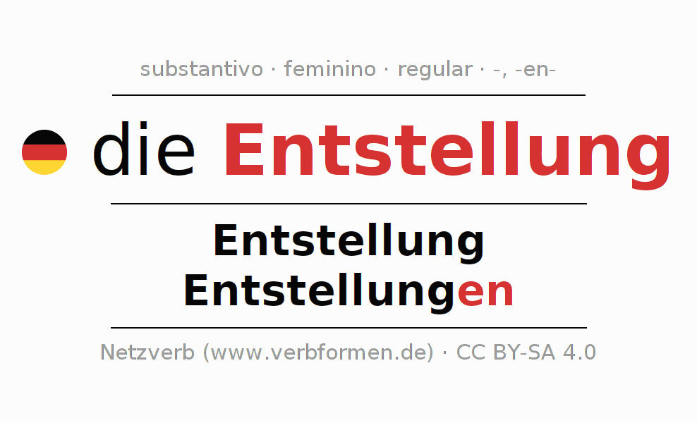 A declinação do substantivo Entstellung (distorção, deformação) está no genitivo singular Entstellung e no nominativo plural Entstellungen . O substantivo fraco Entstellung é declinado com a terminação -/en. O gênero gramatical de Entstellung é feminino e o artigo definido é "die". Não se pode somente declinar o substantivo Entstellung mas sim todos os substantivos em alemão. Comentários ☆