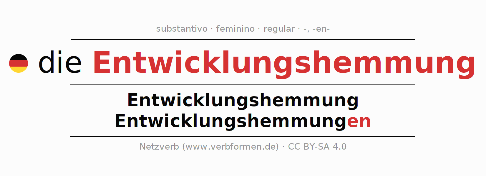 A declinação do substantivo Entwicklungshemmung (inibição do desenvolvimento, obstáculo ao progresso) está no genitivo singular Entwicklungshemmung e no nominativo plural Entwicklungshemmungen . O substantivo fraco Entwicklungshemmung é declinado com a terminação -/en. O gênero gramatical de Entwicklungshemmung é feminino e o artigo definido é "die". Não se pode somente declinar o substantivo Entwicklungshemmung mas sim todos os substantivos em alemão. Comentários ☆