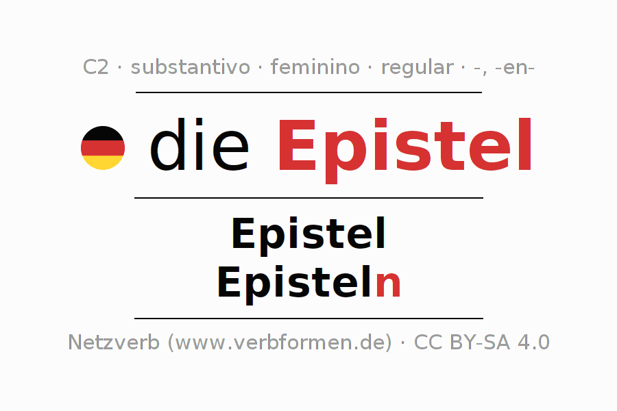 A declinação do substantivo Epistel (epístola, carta) está no genitivo singular Epistel e no nominativo plural Episteln . O substantivo fraco Epistel é declinado com a terminação -/n. O gênero gramatical de Epistel é feminino e o artigo definido é "die". Não se pode somente declinar o substantivo Epistel mas sim todos os substantivos em alemão. O substantivo faz parte do vocabulário referente ao Certificado em Alemão do Nível C2. Comentários ☆