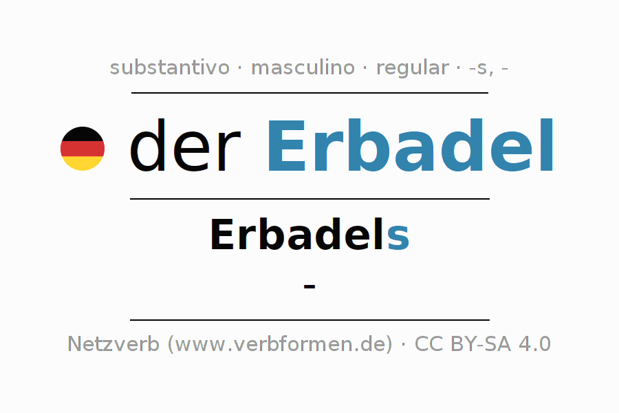 A declinação do substantivo Erbadel (nobreza hereditária) está no genitivo singular Erbadels e no nominativo plural - . O substantivo forte Erbadel é declinado com a terminação s/-. Não há formas no plural. O gênero gramatical de Erbadel é masculino e o artigo definido é 'der'. Não se pode somente declinar o substantivo Erbadel mas sim todos os substantivos em alemão. Comentários ☆