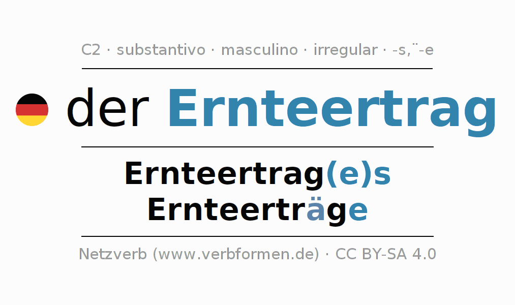 Declinação de Ernteertrag é apresentada em uma tabela com todas as formas no singular e no plural (plural) e em todos os quatro casos: nominativo (1º caso), genitivo (2º caso), dativo (3º caso) e acusativo (4º caso) . Especialmente para os alunos de alemão, a correta declinação da palavra Ernteertrag é fundamental.