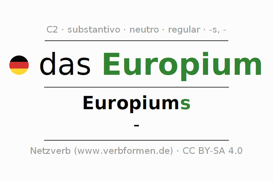 A declinação do substantivo Europium (európio) está no genitivo singular Europiums e no nominativo plural - . O substantivo forte Europium é declinado com a terminação s/-. Não há formas no plural. O gênero gramatical de Europium é neutro e o artigo definido é "das". Não se pode somente declinar o substantivo Europium mas sim todos os substantivos em alemão. O substantivo faz parte do vocabulário referente ao Certificado em Alemão do Nível C2. Comentários ☆