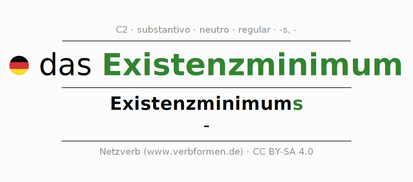 A declinação do substantivo Existenzminimum (mínimo de subsistência, mínimo existencial) está no genitivo singular Existenzminimums e no nominativo plural - . O substantivo forte Existenzminimum é declinado com a terminação s/-. Não há formas no plural. O gênero gramatical de Existenzminimum é neutro e o artigo definido é "das". Não se pode somente declinar o substantivo Existenzminimum mas sim todos os substantivos em alemão. O substantivo faz parte do vocabulário referente ao Certificado em Alemão do Nível C2. Comentários ☆