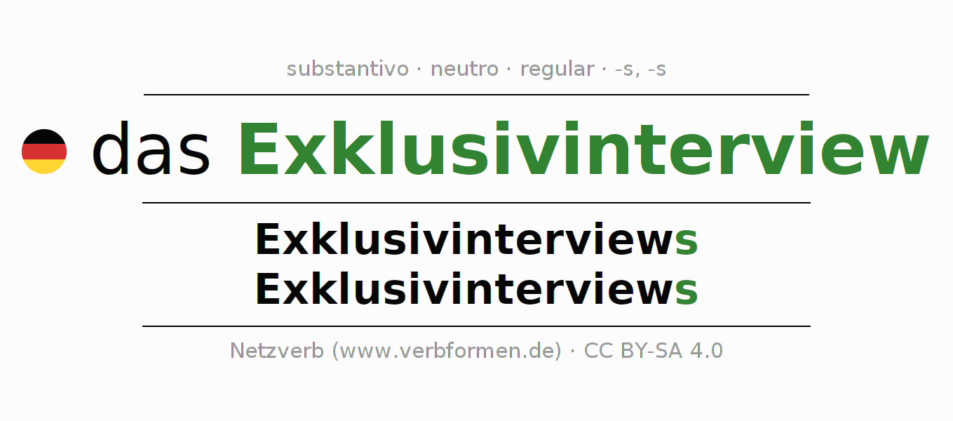 - Singular: das Exklusivinterview, des Exklusivinterviews, dem Exklusivinterview, das Exklusivinterview
