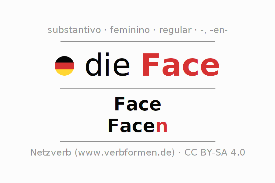 Declinação de Face é apresentada em uma tabela com todas as formas no singular e no plural (plural) e em todos os quatro casos: nominativo (1º caso), genitivo (2º caso), dativo (3º caso) e acusativo (4º caso) . Especialmente para os alunos de alemão, a correta declinação da palavra Face é fundamental.
