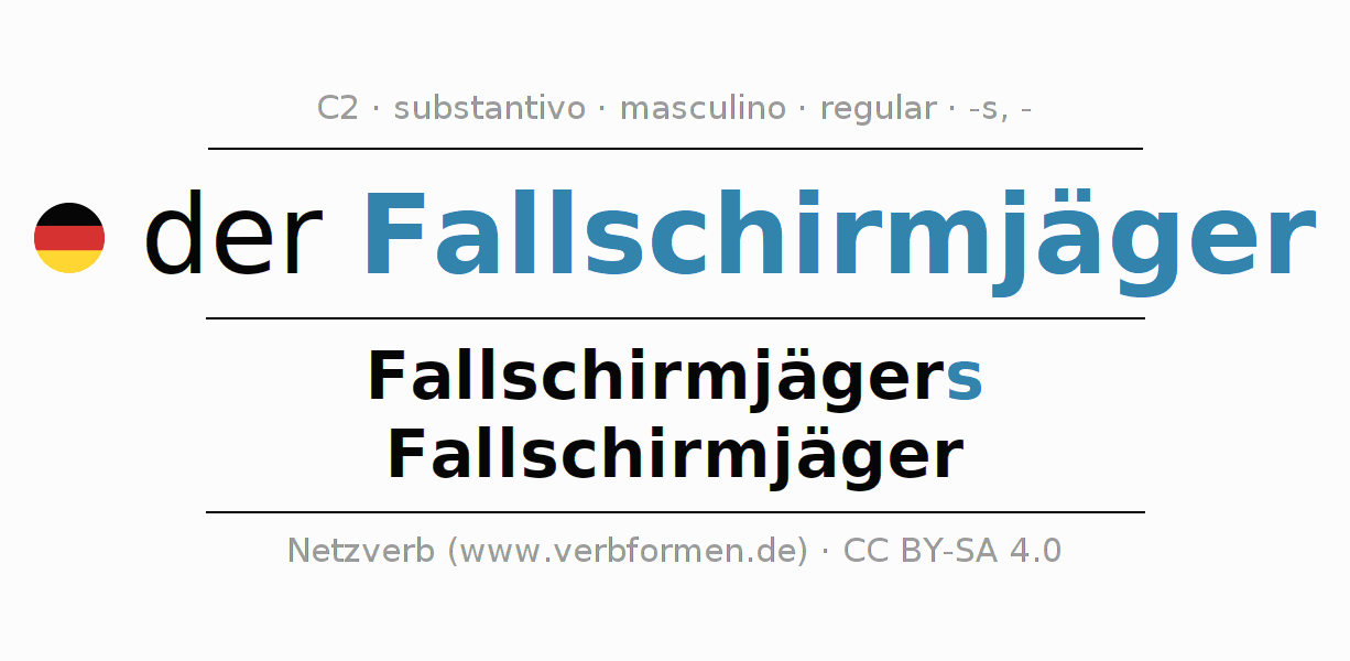 Declinação de Fallschirmjäger é apresentada em uma tabela com todas as formas no singular e no plural (plural) e em todos os quatro casos: nominativo (1º caso), genitivo (2º caso), dativo (3º caso) e acusativo (4º caso) . Especialmente para os alunos de alemão, a correta declinação da palavra Fallschirmjäger é fundamental.