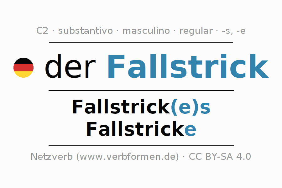 Declinação de Fallstrick é apresentada em uma tabela com todas as formas no singular e no plural (plural) e em todos os quatro casos: nominativo (1º caso), genitivo (2º caso), dativo (3º caso) e acusativo (4º caso) . Especialmente para os alunos de alemão, a correta declinação da palavra Fallstrick é fundamental.
