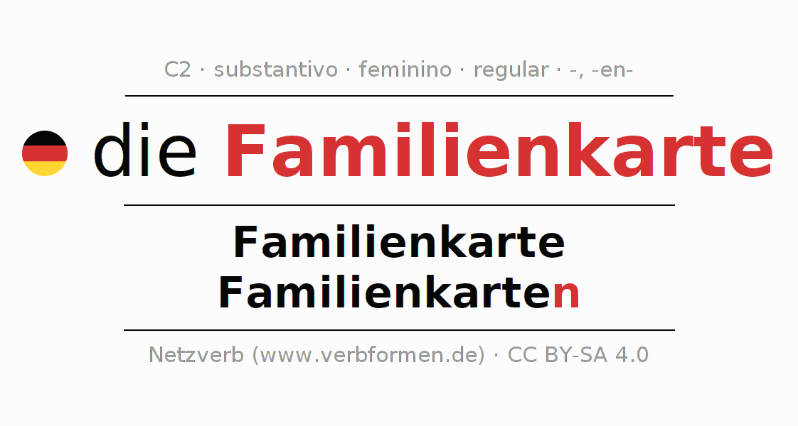 Declinação de Familienkarte é apresentada em uma tabela com todas as formas no singular e no plural (plural) e em todos os quatro casos: nominativo (1º caso), genitivo (2º caso), dativo (3º caso) e acusativo (4º caso) . Especialmente para os alunos de alemão, a correta declinação da palavra Familienkarte é fundamental.