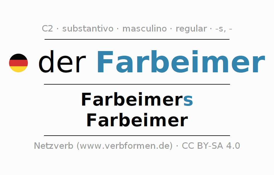 Declinação de Farbeimer é apresentada em uma tabela com todas as formas no singular e no plural (plural) e em todos os quatro casos: nominativo (1º caso), genitivo (2º caso), dativo (3º caso) e acusativo (4º caso) . Especialmente para os alunos de alemão, a correta declinação da palavra Farbeimer é fundamental.