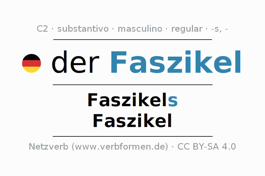 Declinação de Faszikel é apresentada em uma tabela com todas as formas no singular e no plural (plural) e em todos os quatro casos: nominativo (1º caso), genitivo (2º caso), dativo (3º caso) e acusativo (4º caso) . Especialmente para os alunos de alemão, a correta declinação da palavra Faszikel é fundamental.