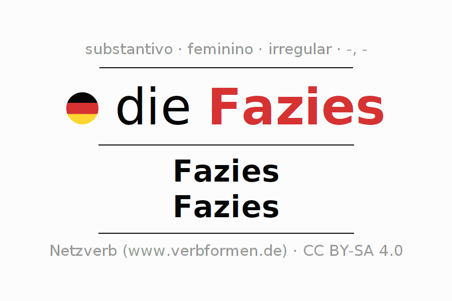 A declinação do substantivo Fazies (facies) está no genitivo singular Fazies e no nominativo plural Fazies . O substantivo Fazies é declinado com as terminações -/-. O gênero gramatical de Fazies é feminino e o artigo definido é "die". Não se pode somente declinar o substantivo Fazies mas sim todos os substantivos em alemão. Comentários ☆