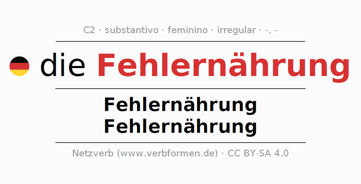 Declinação de Fehlernährung é apresentada em uma tabela com todas as formas no singular e no plural (plural) e em todos os quatro casos: nominativo (1º caso), genitivo (2º caso), dativo (3º caso) e acusativo (4º caso) . Especialmente para os alunos de alemão, a correta declinação da palavra Fehlernährung é fundamental.