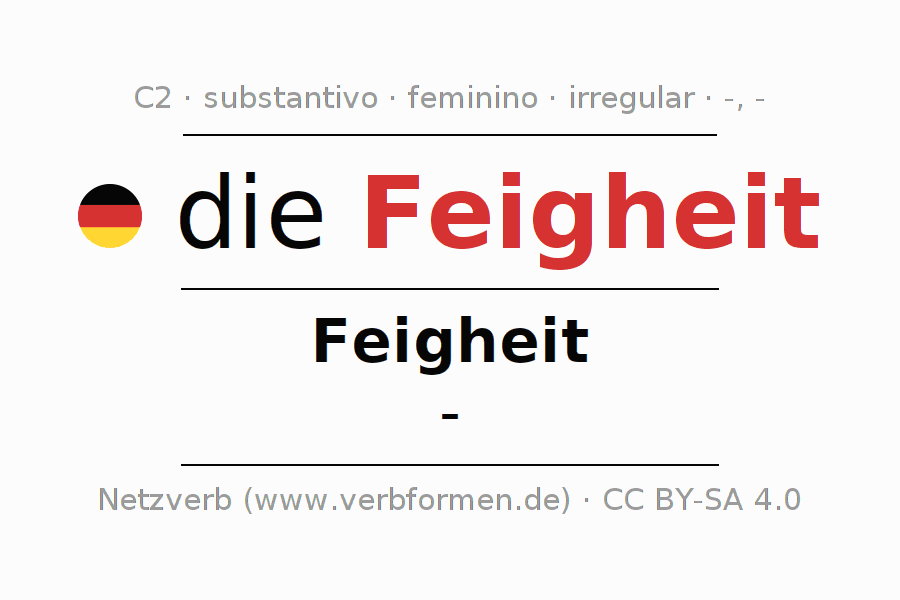 A declinação do substantivo Feigheit (covardia, cobardia) está no genitivo singular Feigheit e no nominativo plural - . O substantivo Feigheit é declinado com as terminações -/-. Não há formas no plural. O gênero gramatical de Feigheit é feminino e o artigo definido é "die". Não se pode somente declinar o substantivo Feigheit mas sim todos os substantivos em alemão. O substantivo faz parte do vocabulário referente ao Certificado em Alemão do Nível C2. Comentários ☆