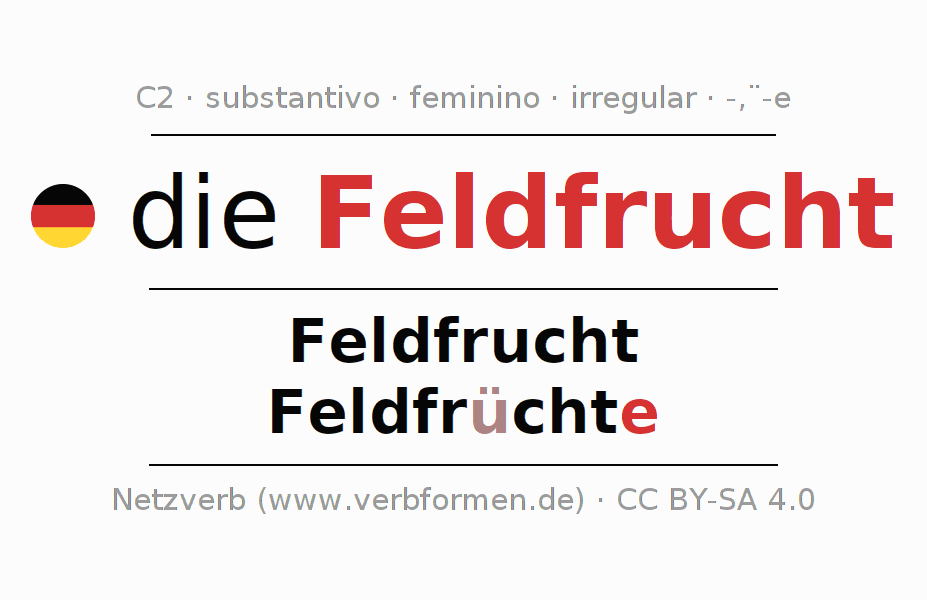 Declinação de Feldfrucht é apresentada em uma tabela com todas as formas no singular e no plural (plural) e em todos os quatro casos: nominativo (1º caso), genitivo (2º caso), dativo (3º caso) e acusativo (4º caso) . Especialmente para os alunos de alemão, a correta declinação da palavra Feldfrucht é fundamental.