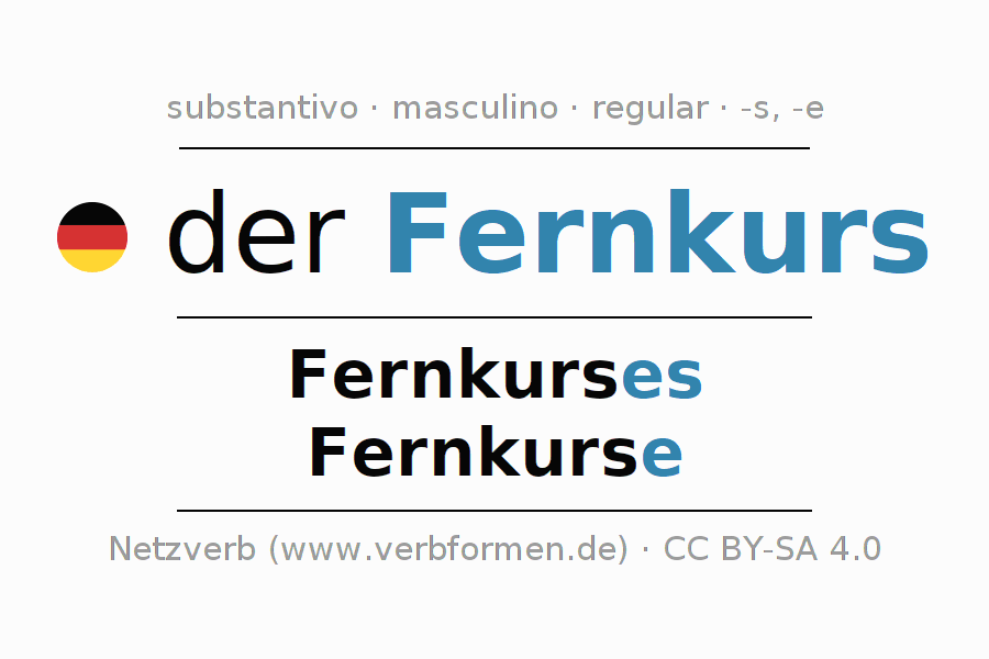 A declinação do substantivo Fernkurs (curso a distância, curso à distância) está no genitivo singular Fernkurses e no nominativo plural Fernkurse . O substantivo forte Fernkurs é declinado com a terminação es/e. O gênero gramatical de Fernkurs é masculino e o artigo definido é 'der'. Não se pode somente declinar o substantivo Fernkurs mas sim todos os substantivos em alemão. Comentários ☆