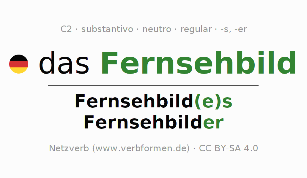 Declinação de Fernsehbild é apresentada em uma tabela com todas as formas no singular e no plural (plural) e em todos os quatro casos: nominativo (1º caso), genitivo (2º caso), dativo (3º caso) e acusativo (4º caso) . Especialmente para os alunos de alemão, a correta declinação da palavra Fernsehbild é fundamental.
