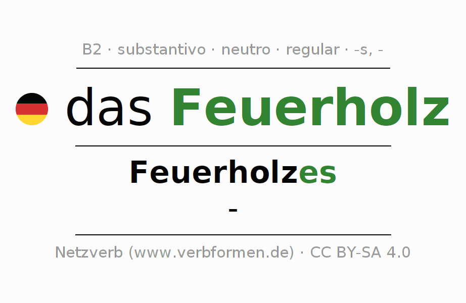 A declinação do substantivo Feuerholz (lenha) está no genitivo singular Feuerholzes e no nominativo plural - . O substantivo forte Feuerholz é declinado com a terminação es/-. Não há formas no plural. O gênero gramatical de Feuerholz é neutro e o artigo definido é "das". Não se pode somente declinar o substantivo Feuerholz mas sim todos os substantivos em alemão. O substantivo faz parte do vocabulário referente ao Certificado em Alemão do Nível B2. Comentários ☆
