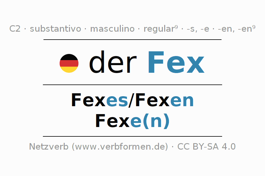 Declinação de Fex é apresentada em uma tabela com todas as formas no singular e no plural (plural) e em todos os quatro casos: nominativo (1º caso), genitivo (2º caso), dativo (3º caso) e acusativo (4º caso) . Especialmente para os alunos de alemão, a correta declinação da palavra Fex é fundamental.