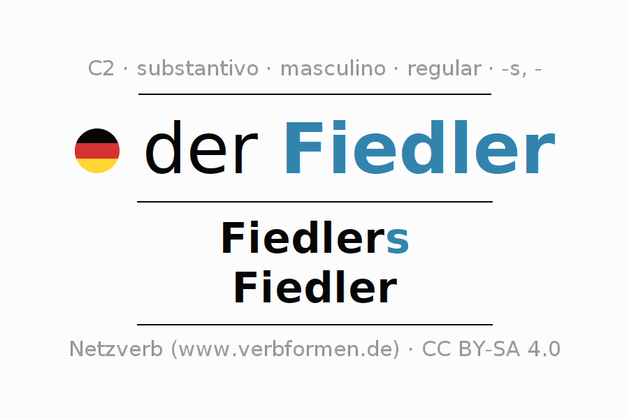 Declinação de Fiedler é apresentada em uma tabela com todas as formas no singular e no plural (plural) e em todos os quatro casos: nominativo (1º caso), genitivo (2º caso), dativo (3º caso) e acusativo (4º caso) . Especialmente para os alunos de alemão, a correta declinação da palavra Fiedler é fundamental.
